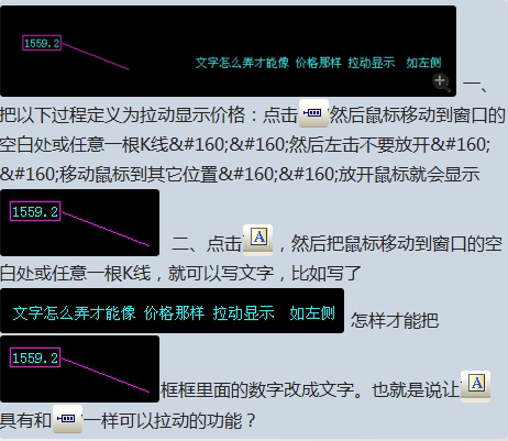你点击按键 然后鼠标移动到窗口的空白处或任意一根K线的位置  然后左击不要放开  移动鼠标到其它位置  放开鼠标就会显示 文字