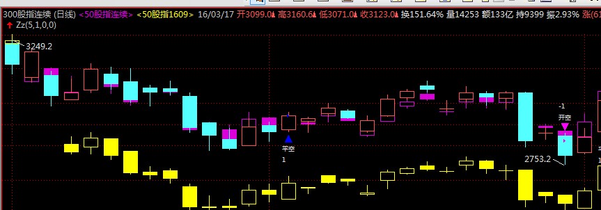 在自编公式应用于图后,K线显示紊乱,品种是300,1时间纵坐标对应怎么显示出三种颜色,上3个K线?左上角出现50期货,IH 09字样?但是对应价格也不对啊?