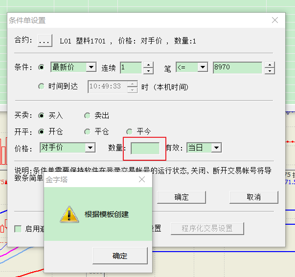 提个小建议,在条件单设置里面,数量默认是1,修改数量时,一般先把默认数量删除,再写上新的数量,但一旦删除这个1,就会跳出提示框“根据模版创建”,见截图,很麻烦。每次修改数量都要去确认一下。虽然可以用鼠标选中这个1,然后直接修改,但请考虑只用键盘,或者手机上远程控制电脑的使用场景。如果能改成上面的条件设置里面,“连续()笔”的那个窗口就挺好。