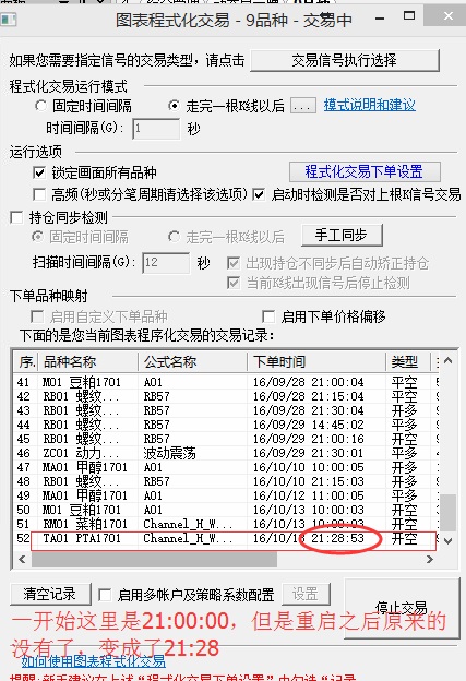图表上的交易记录退出后会记录的,除非你非正常关闭金字塔了,正常情况下,如果当前K线已经下单过了,下次启动交易时,金字塔会提示你是否继续下单的