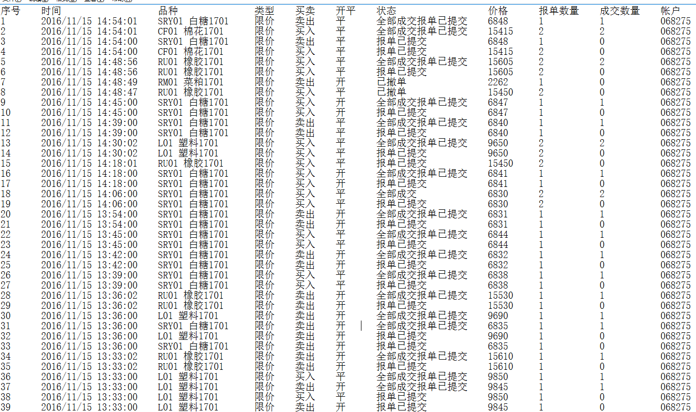 70      SRY01 白糖1701     KK          16/11/15 14:45:00    开多    1         6847      1       068275