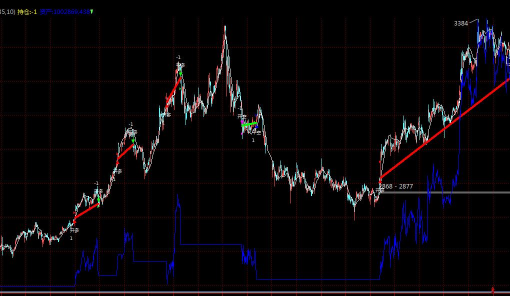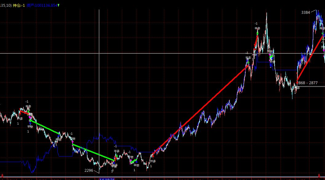 2. 我主要是做趋势跟随系统,有的交易的持续周期很长,可能远远超过600根K线,一旦产生进场信号的位置超过了设置的这个数量限制,那么进场信号消失,显示的就是上一个平仓信号,或者新的进场信号,这样的结果完全不是所需要的,而且失去的是趋势跟随系统主要想抓住的盈利巨大的交易。对于一个信号能持续多长时间当然是无法预测的,再加上操作框架上看到的明显的缓慢,所以不能通过设置一个固定的K线数来解决。以下两张截图是同一个模型运行在螺纹上的效果显示,其中10月11日进场持续到11月8日的一个收益大单,在显示数量不够的情况下被切分成几个小的波段交易。