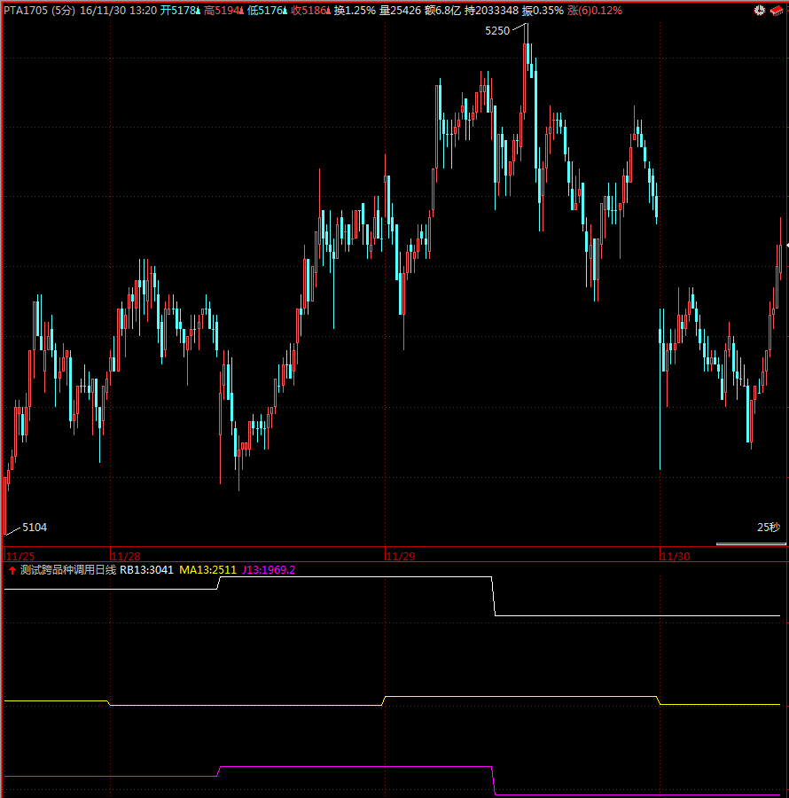 举例:郑商所的品种(pta)5分钟K线下,调用大商所(j)的品种的昨天日线