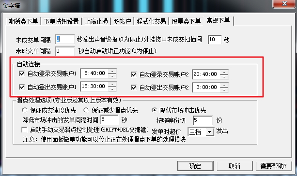 1,在交易---下单设置---常规下单中,设置自动登录登出,并配置好账户登录信息,勾选10秒自动按设置自动登录。盘中短暂断线后,能自动登录账户。