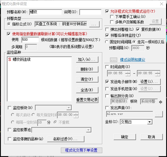 都设置好了,可还是没有发邮件,我把公式直接改成这样也不行,SENDMAIL(CURRENTTIME>=132700,'5752197@qq.com','自营交易启动','自营交易启动');