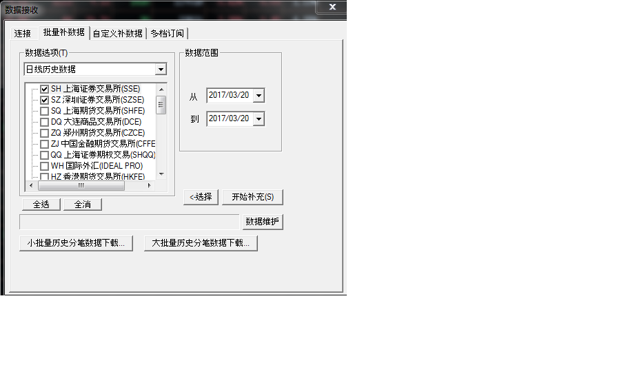 (2)自定义数据补充对于免费版是50个(这个可以理解,如果我想补充所有股票市场的日线数据,例如上海A股和深圳A股,如何操作,如果使用的是(1)的情况的话,还是希望管理员可以修改一下批量补数据的tab,能使之更直观一下)