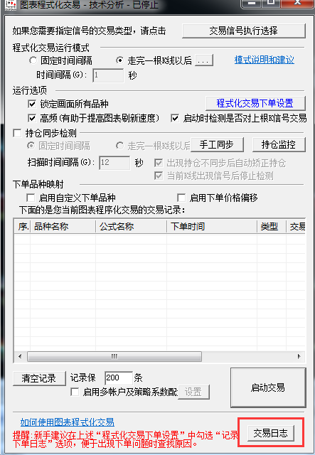 2、详细的触发交易过程可以在交易日中查看。先在交易---下单设置---程式化交易中勾选记录下单日志。交易日志文件从交易--图表程序化交易中的右下角进入,如下图: