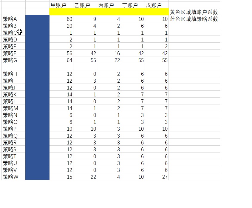 这种模式,甲乙丙丁戊 这五个账户都是每个对应的参数都是成比例的,  上面的系数矩阵按照列成比例的。