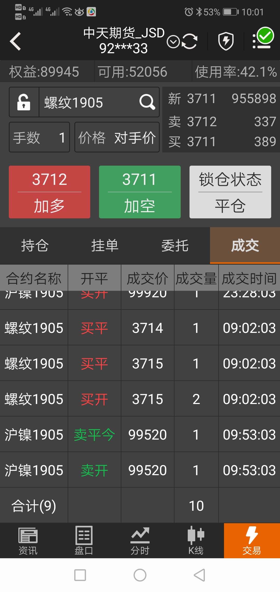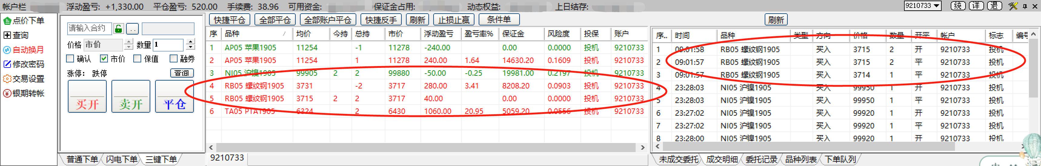 今早一开盘,螺纹对冲策略出信号,平空开多2手,形成空单2手多单2手(之前是持有4手空单的),但成交明细又出现错误显示,平3手空单成交2手多单,明显出现错误