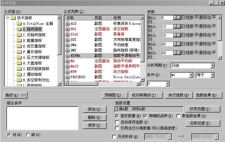 条件选股界面   中的条件 选项   有 这些功能。