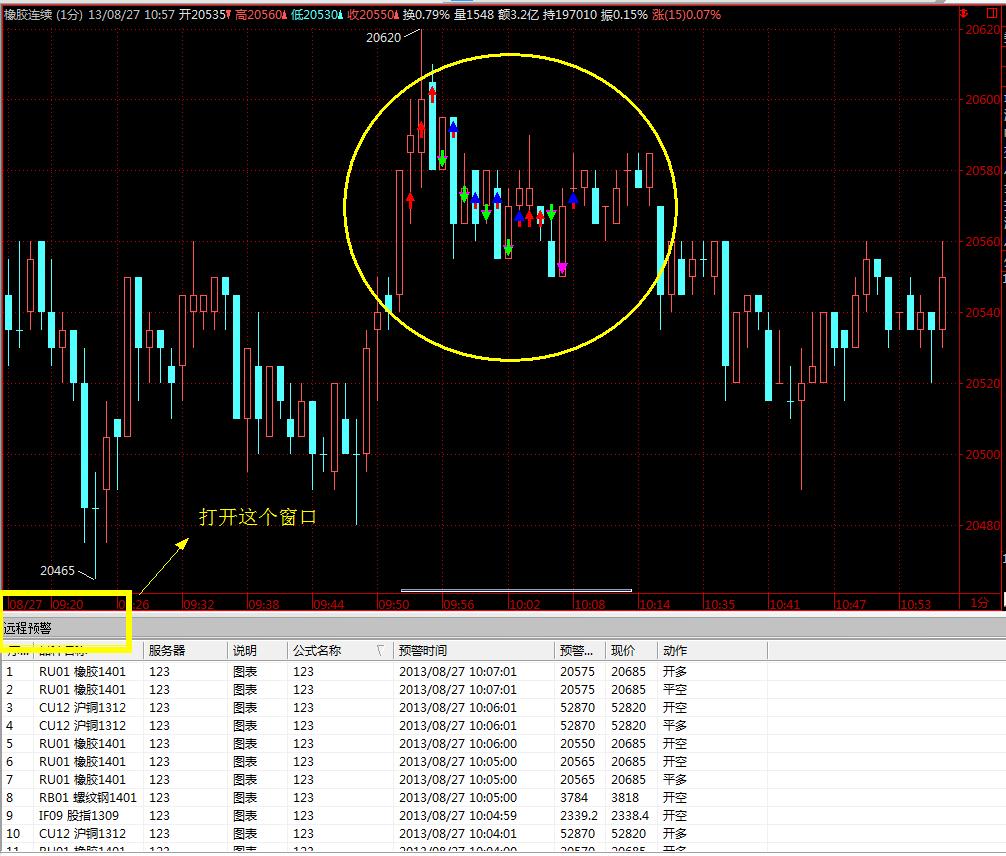 2、你要将  远程预警  窗口打开才能在K线上显示信号