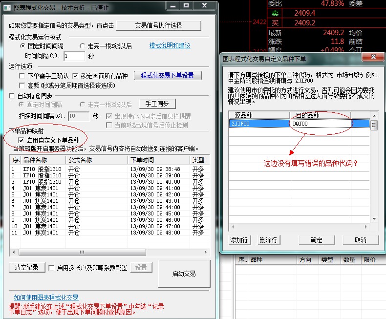 您好,是否在交易-图表程序化界面启用了自定义品种下单,目标品种代码没写正确。