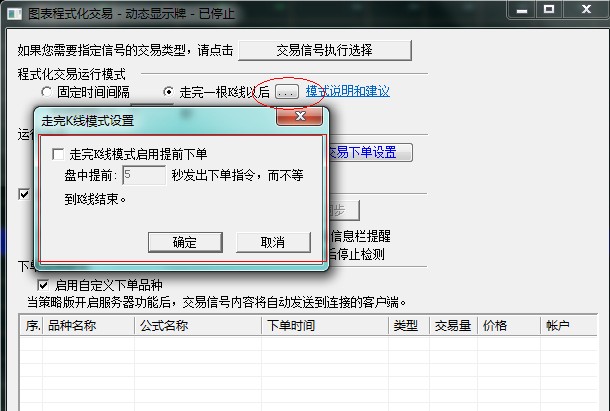走完一根K模式右边有个选项的点击开可以设置提前多少下单。