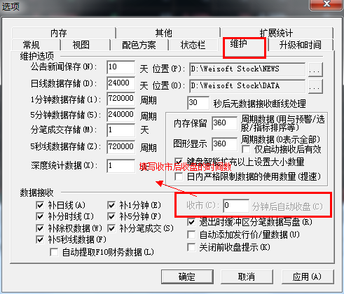 3,对应在工具-选项处设置,执行自动收盘请保证您本地当日分笔数据完整