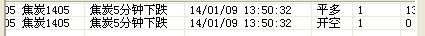 2       J05 焦炭1405    焦炭5分钟下跌    14/01/09 13:50:32    开空    1         0       0       11600868