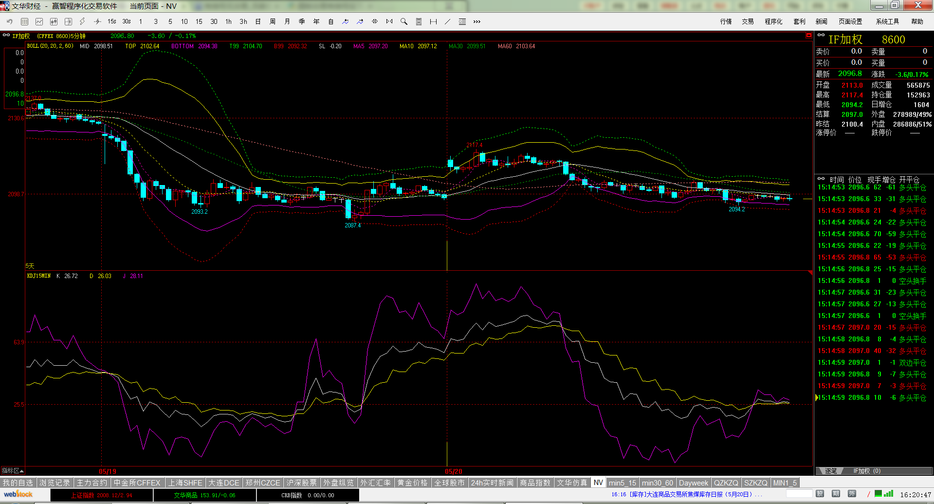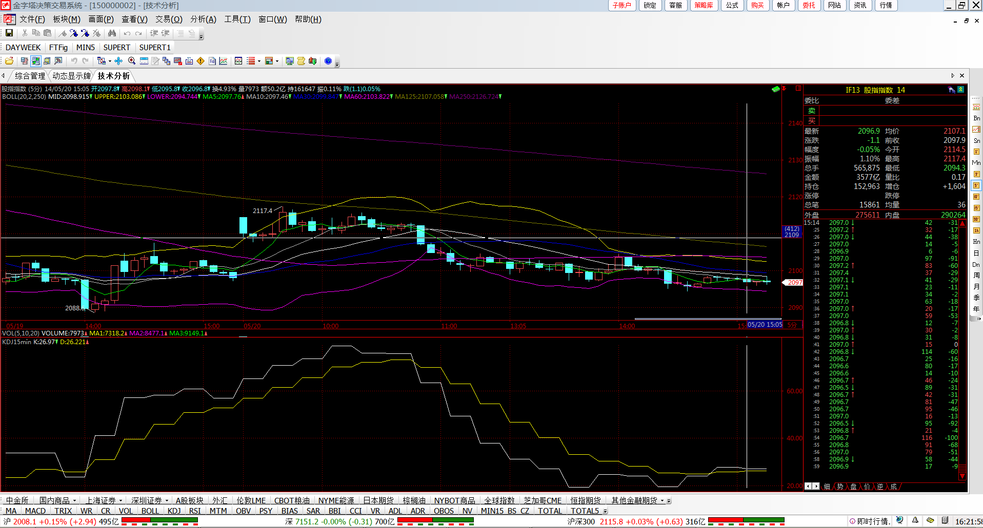 附上两个截图,一个是文华财经,一个是金字塔,两张图都是在5分钟K线图上显示15分钟周期的KDJ指标。