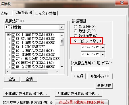 1,在工具-》数据接收-》批量补数据界面的右下角有历史数据文件包。