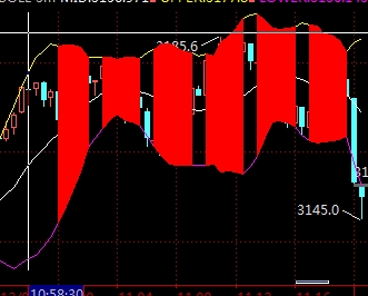 取3分钟的MACD,当MACD柱大于0(K线走完)时,在30秒图的布林通道上下轨间涂红色,涂红色的范围为信号开始后的整个3分钟。