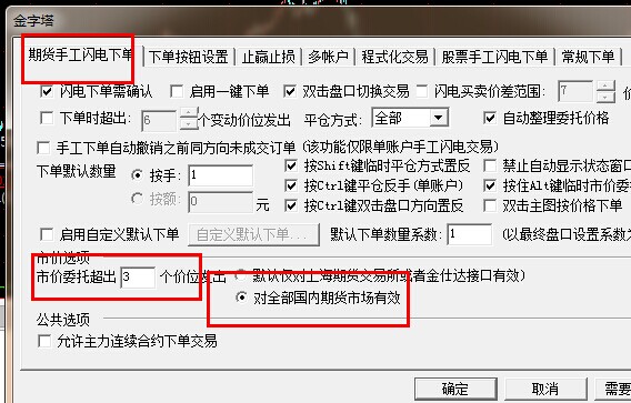 这里是更改市价选项,更改后你所有市价报单软件都会以对价超3个价位去发出。