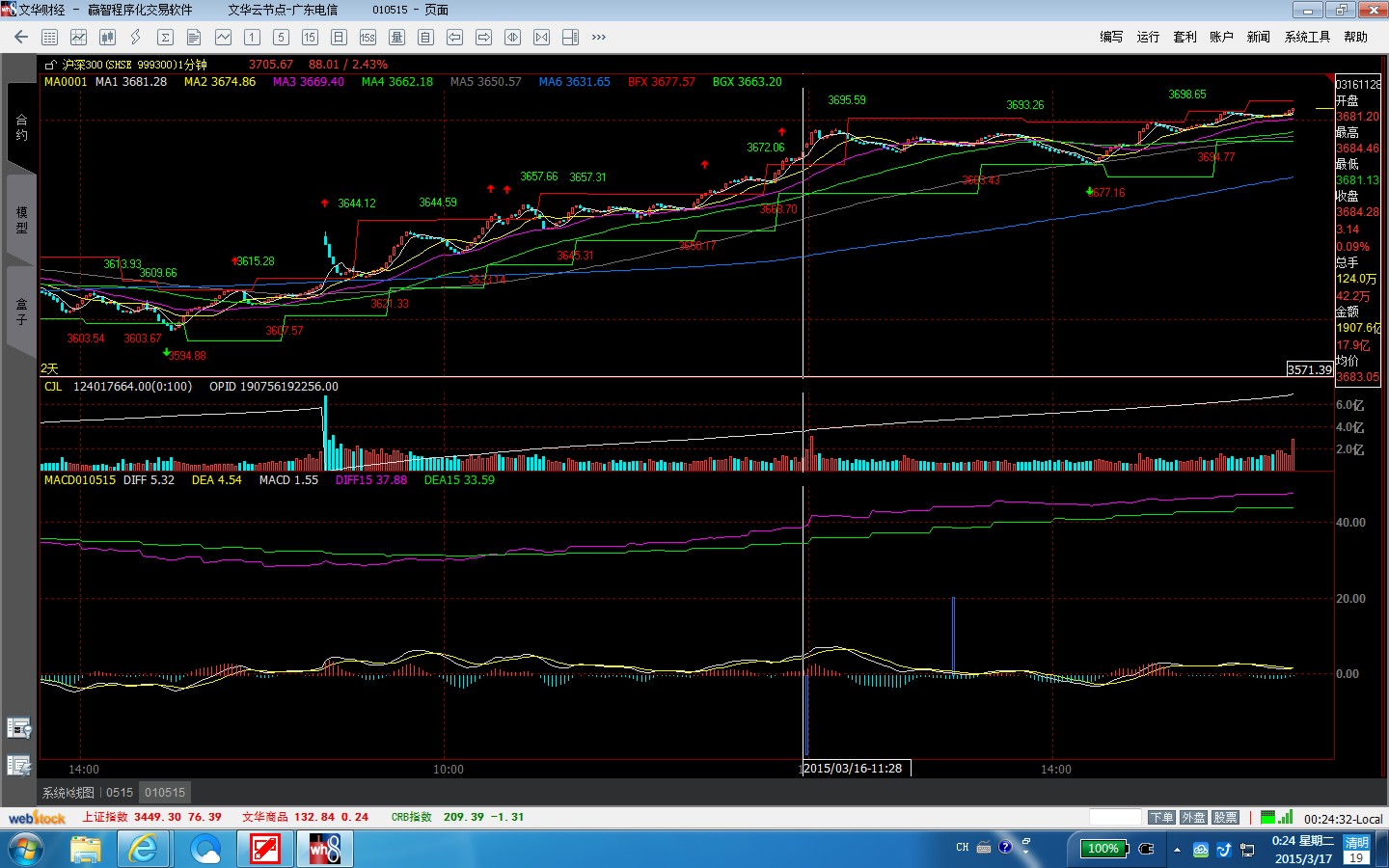另外附上文华的图,文华的显示是我认可的,但我本人还是喜欢用金字塔,因为金字塔可以在期指下跨周期跨合约调用SH300指标的数据,而文华不可以。