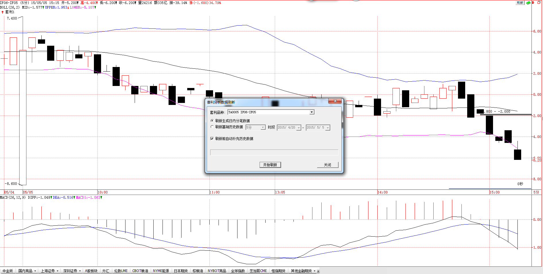 我在用套利合约时,其中的数据好像有点问题 ,刷新生成日内分笔数据后就没有了上下引线,请问是怎么回事?。。。