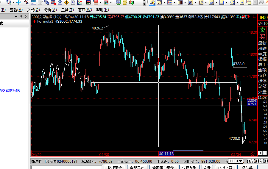 股指1分钟K线上面,叠加HS300 1分钟收盘价,采用如下公式: