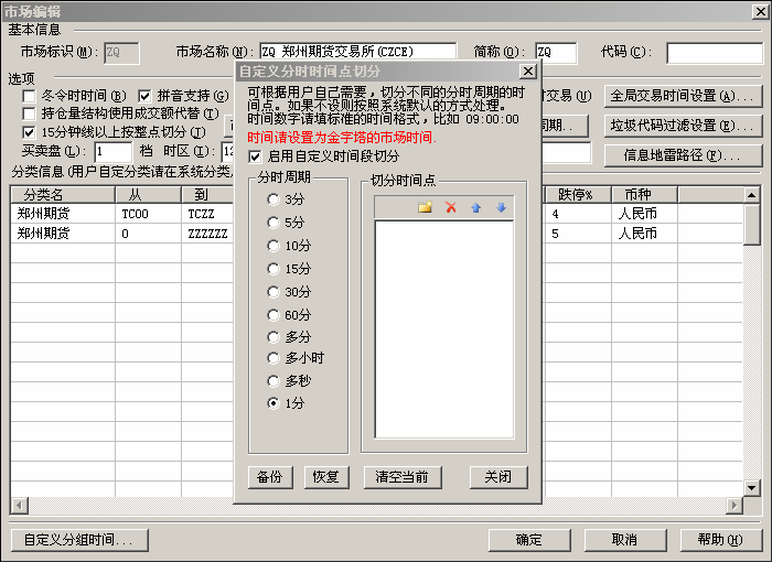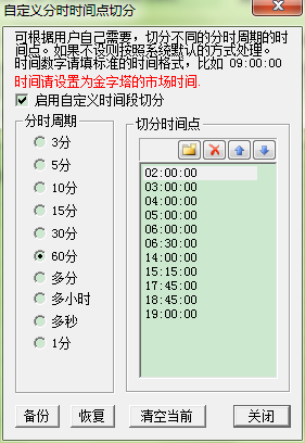金字塔默认是每过一个小时就把“小时K线”加一根,但国内期货有变态的10:15休盘时间,这样到11:00中的时候金字塔默认也在小时K线里加一根。版主说可以自定义切分时间,是不是意思是说可以按照分钟计数,每计数到60时才在小时线里面加一根K线?设置的自定义分时没有保存按钮,或者不明其“切分时间点”含义,请高手帮忙指点一下,谢谢。
