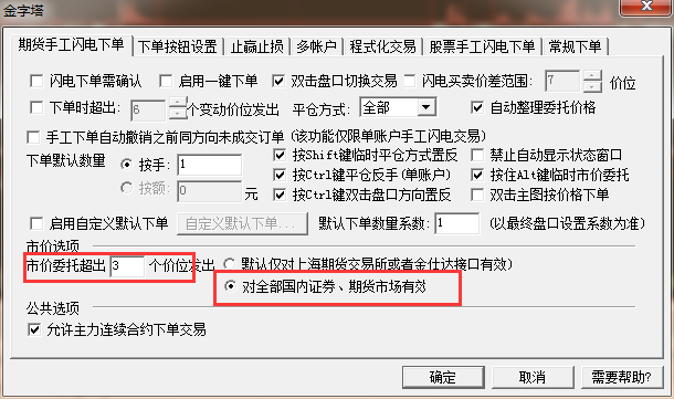 你可以把市价改成限价或在交易-》下单设置 里勾选对全部国内市场有效