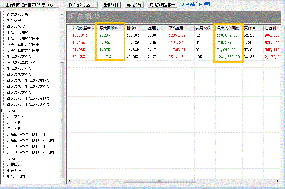 一个策略测试3个品种,生成组合报告,在组合分析-汇总报告中,“最大回撤%”这一项,为什么组合的最大回撤率是负数?最大资产回撤也是负数?怎么理解?