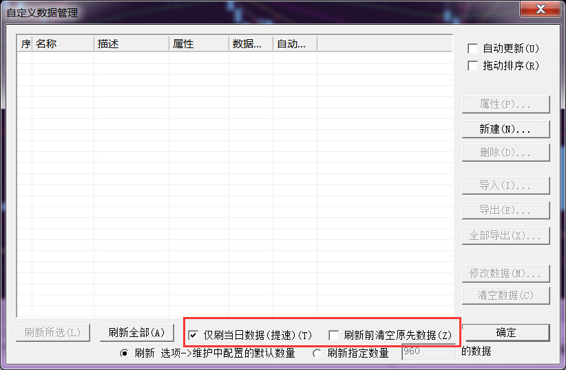 另外你可以事先将历史数据手工刷新好,然后自动刷新勾选 仅刷当日数据,然后再取消勾选刷新前清空原先数据选项,只动态刷新今天的,可以进一步提高刷新效率