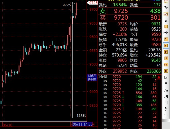 然后 我翻到塑料 当天总共只有2根5分钟线  第二根居然是14.35的