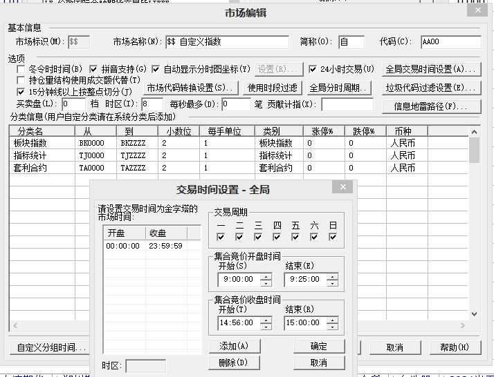 等我现在重新建立指数,指数归属自定义板块指数,然后在菜单栏修改字段自定义板块指数交易时间为24小时再试验试验。