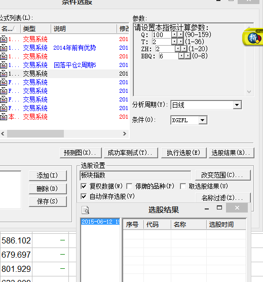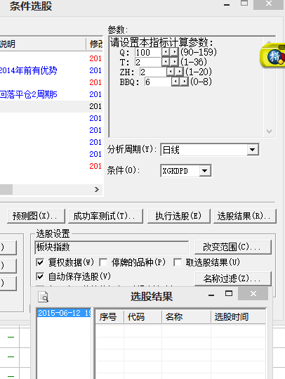 在楼上我贴的动态显示牌里可以看到XGKDPD 和XGZFL 列的1都是选股满足的结果