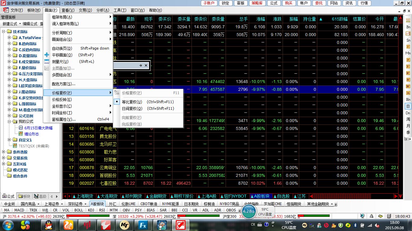 我明白了,在报价表里不能设置向前复权和向后复权,所以报价列表里用自定义公式计算出来的数据就是错误的,这是软件的bug