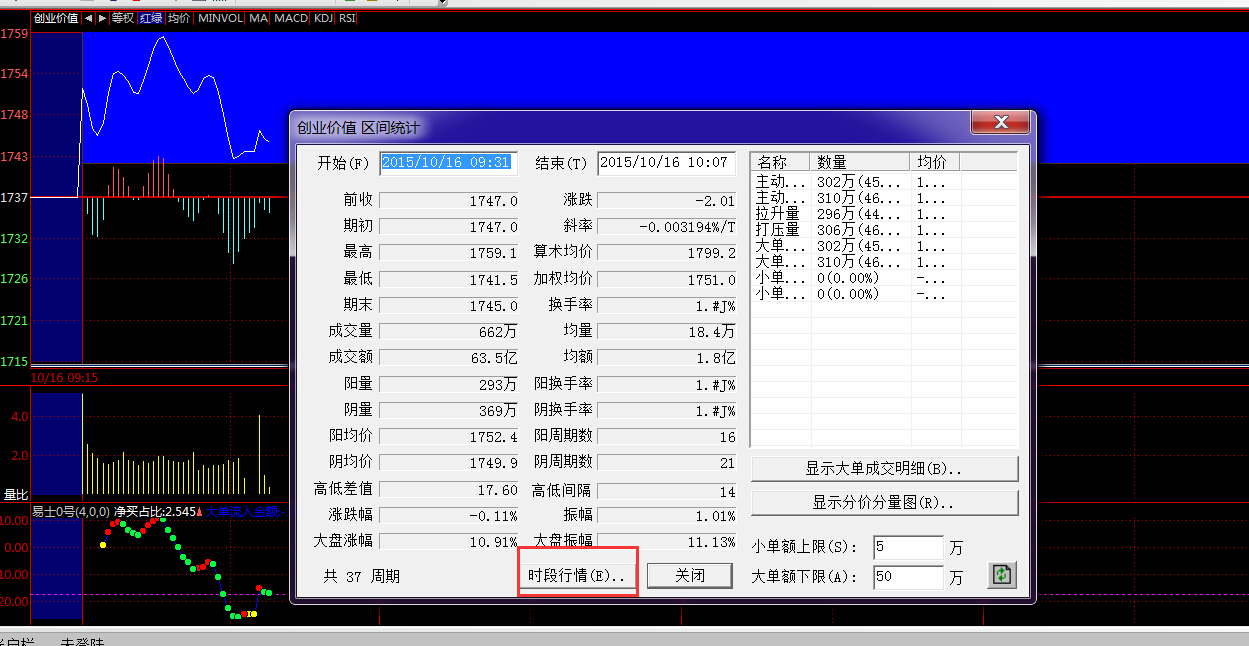 打开一个股票的分时图,选择 分析菜单->区间统计-》然后看图