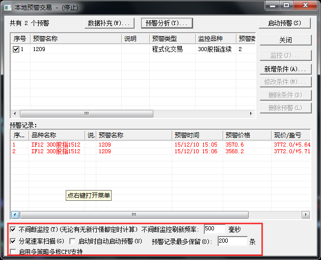 在秒周期及分笔测试时 建议你按照上图设置 分笔速率扫描 不间断监控