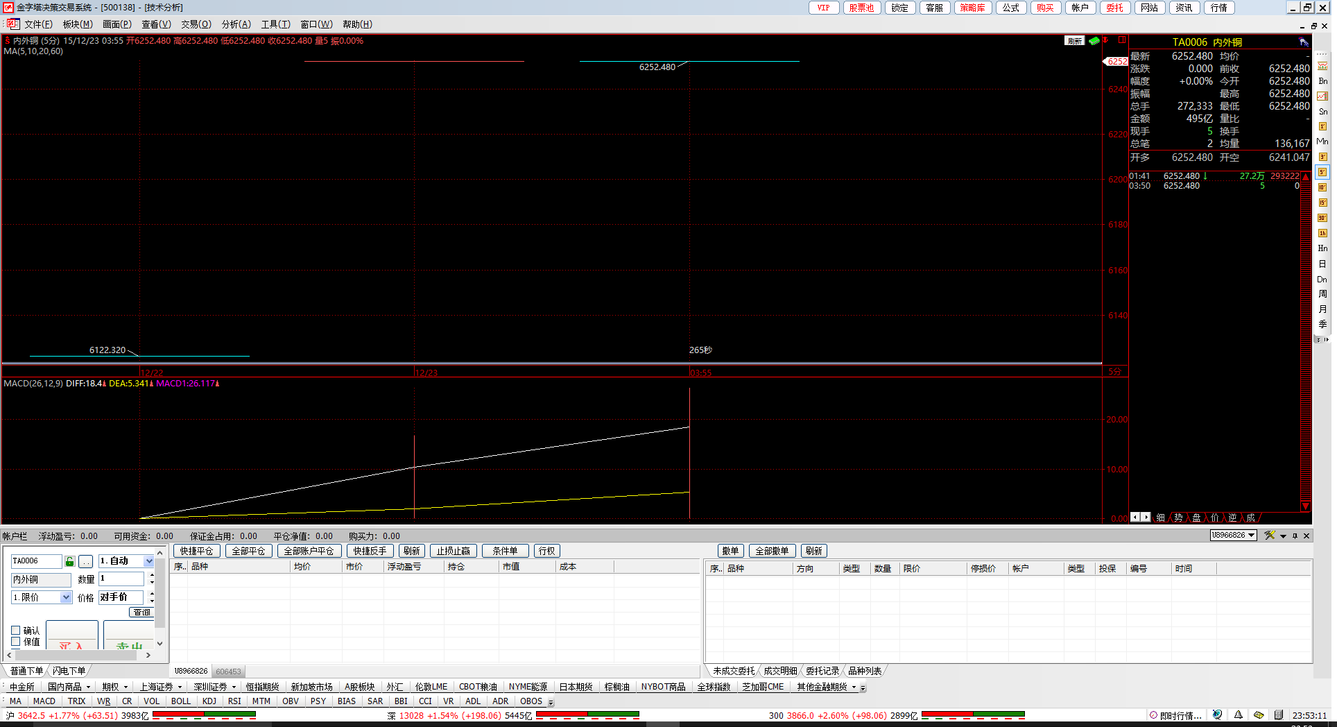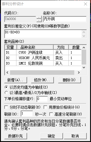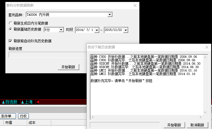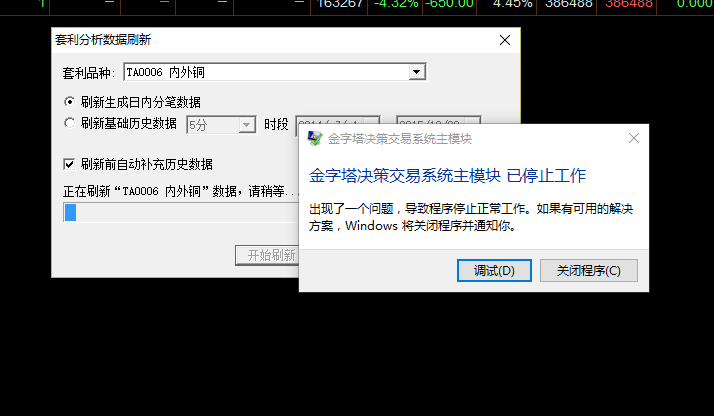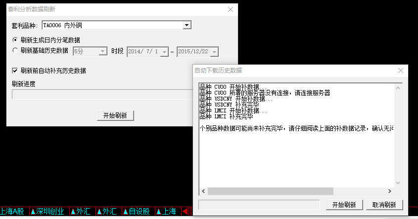 使用专业版模拟软件,建立沪铜的内外盘套利合约,如图1. 刷新分笔数据时系统crash(图3),刷新5分钟数据成功但仅可显示两三根K线(图5)。