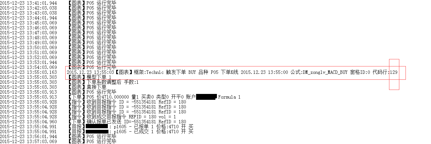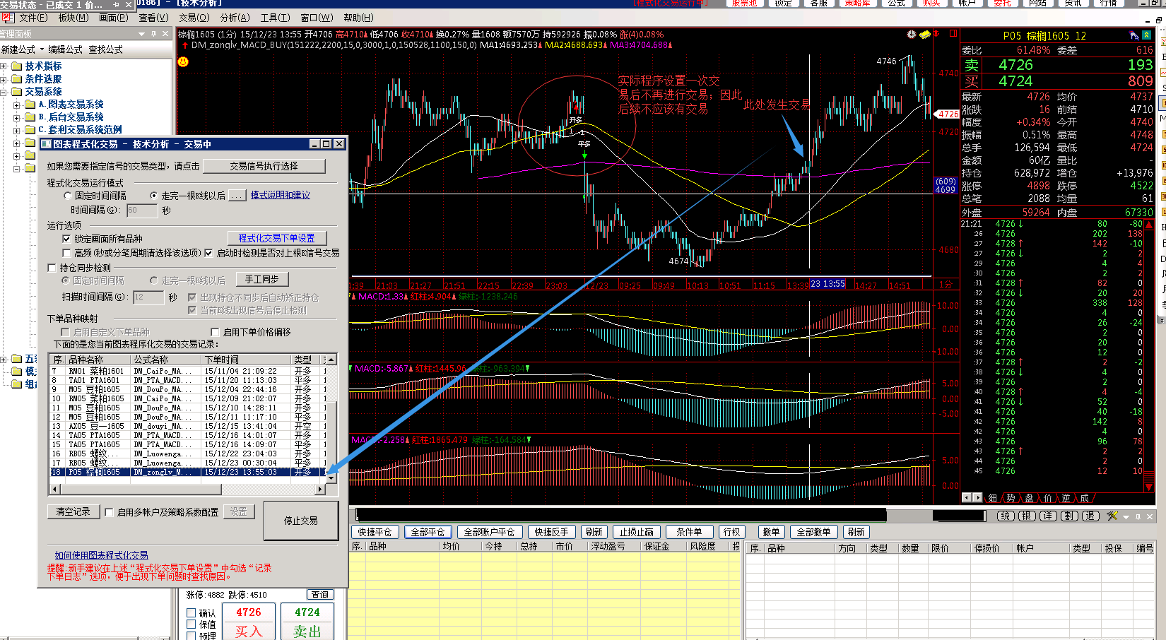 在图表交易中,使用自定义的程序,做多棕榈1605。程序限制交易一次后不再进行交易。