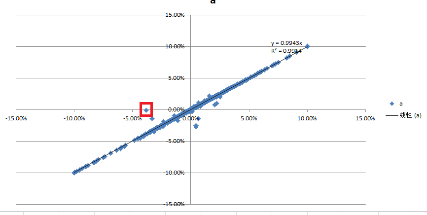 然后我手动导出8个个股历史数据,然后计算个股的收盘涨跌幅(计算公式为:当天收盘价/前一交易日收盘价-1),做出金字塔计算的板块指数与手动计算的个股涨跌幅的散点图,如下,整体趋势吻合,但是不完全一致,个别点差异较大,其中下图中框出来的点的日期是2015-07-30。
