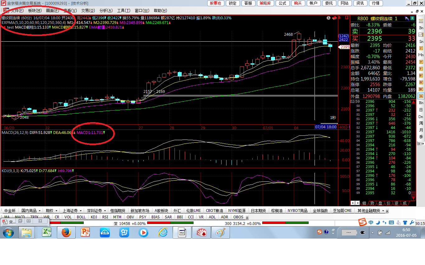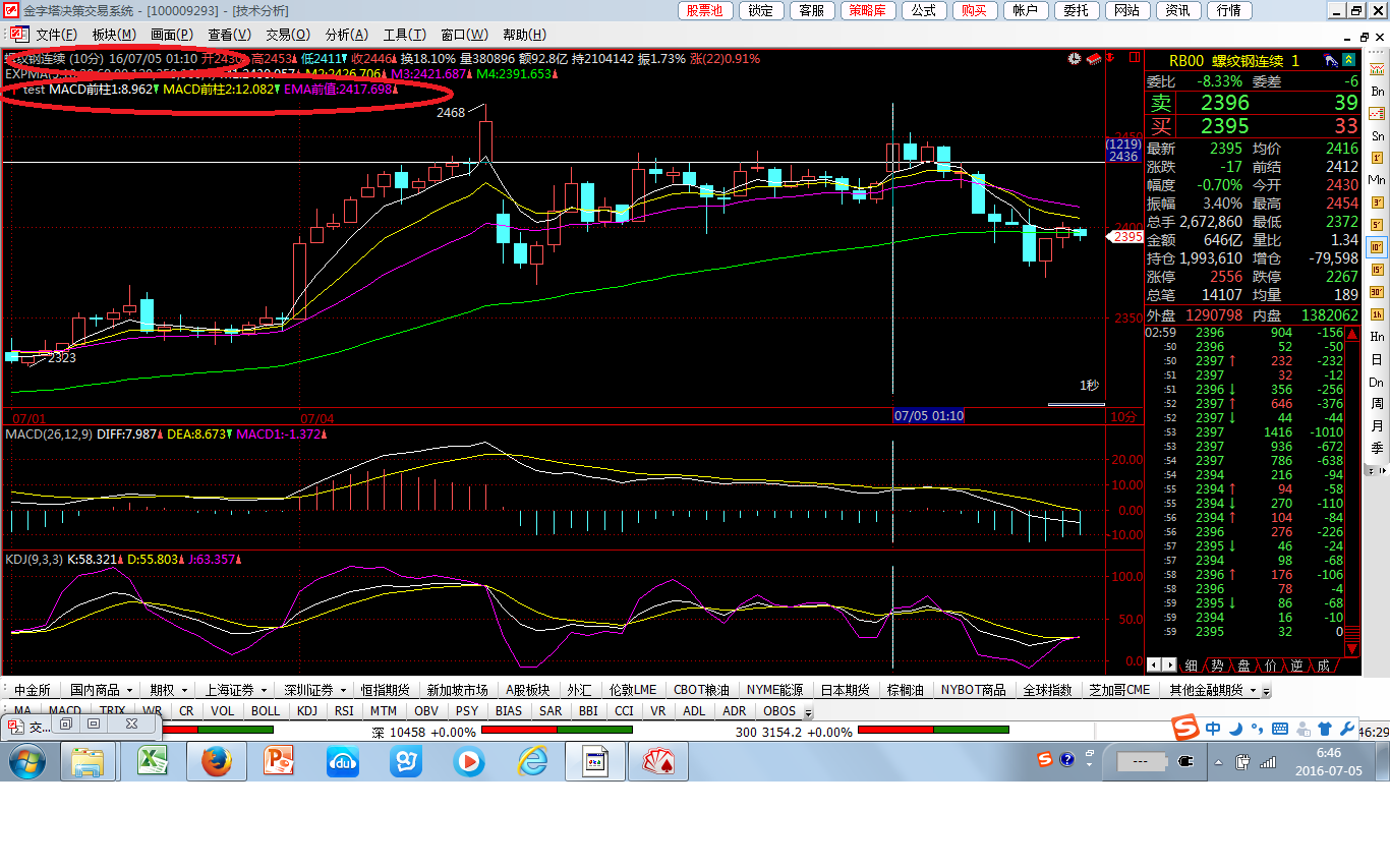 但是EMA值的引用结果却是正确的,在10分钟周期上的2016年7月5日01:10分的K线上看,前值为2417.698,在60分钟K图2016年7月4日19:00的上看,确实为2417.698,这个是对得上的。