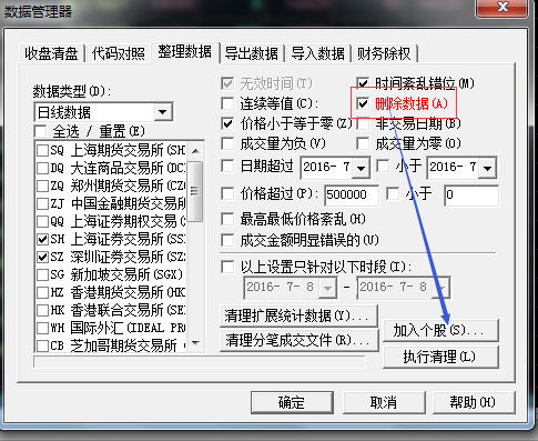请问:  在数据管理、整理数据里面,可以对沪深A股,指定时间段的  “日线数据”  进行删除吗?