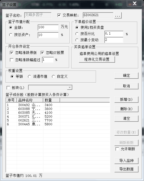 篮子设置好后通过交易sz002621 对篮子里的品种下单。