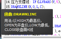 压力支撑线: IF(LLVBARS(V,5), REF (C,LLVBARS(V,5)),C),colorred,LINETHICK2;