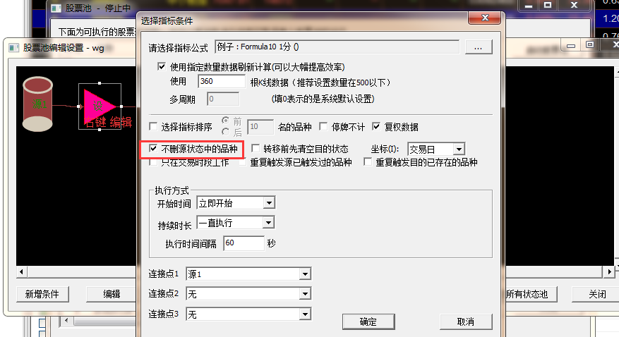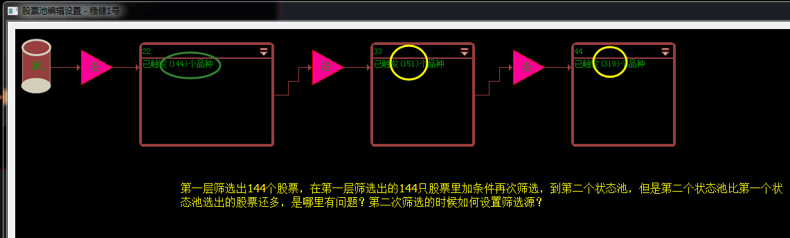 参考楼上的设置,你应该是源池中的股票更换过,并没有勾选"转移前清空目的状态"这一项,导致你之前的触发的其他品种没有清理掉。