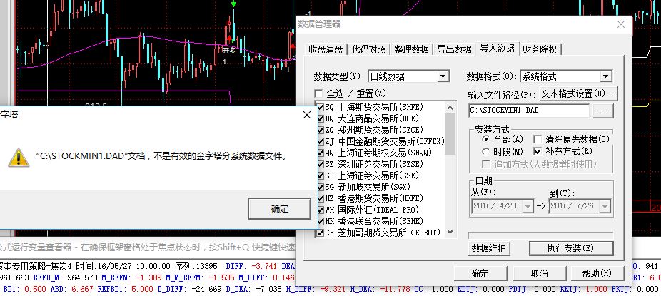 周期类型不匹配。你的数据是1分钟周期的。而你在导入界面中,选择的数据类型是日线周期。
