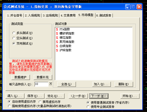 主题:请问一下软件自带的双向海龟测试 里面怎么让一笔资金适用于多品种回测, 因为软件里只有每只品种投入多少的选项,