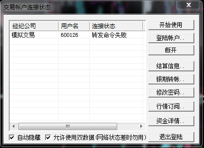 还有一个问题,点委托进入模拟交易帐户连接状态,经常会在开盘前断开,连接状态显示"转发命令失败",