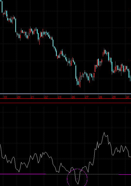 白线下降到20以下并再次上穿时买入,图中画圆圈的