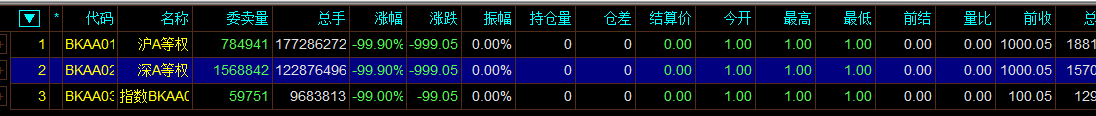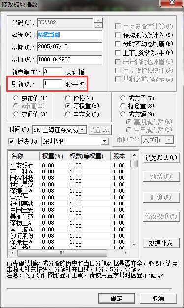 在板块-自编指数 设立成功后(等权重),行情板上显示了成交量和成交金额,但无法显示价格,开收高低全是1,历史数据也无法显示。系统自带的BKAA01 BKAAO2 两个等权重指数也是这样?