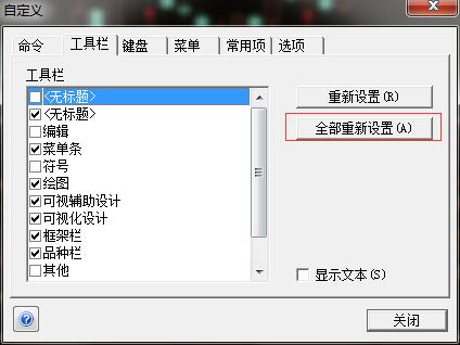 重置下,工具 -  更多功能 - 自定义菜单 - 工具栏,点击“重新设置”